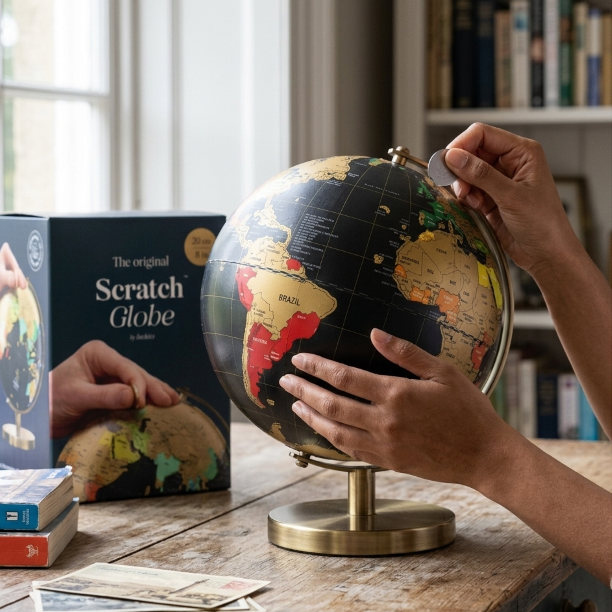 A perfect Christmas gift this premium, interactive world globe is made from durable paper, metal, wood, and plastic. It has a quality printed map with a metallic gold-foil coating that can be gently scratched away to reveal bright colours beneath each country.